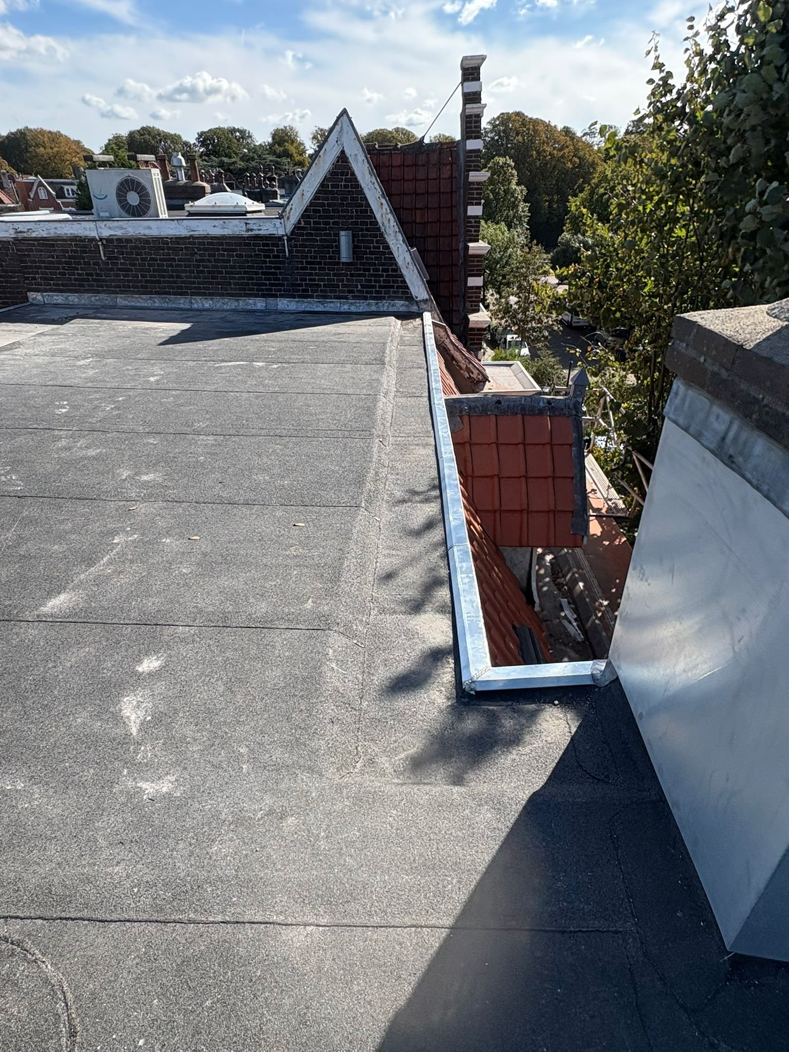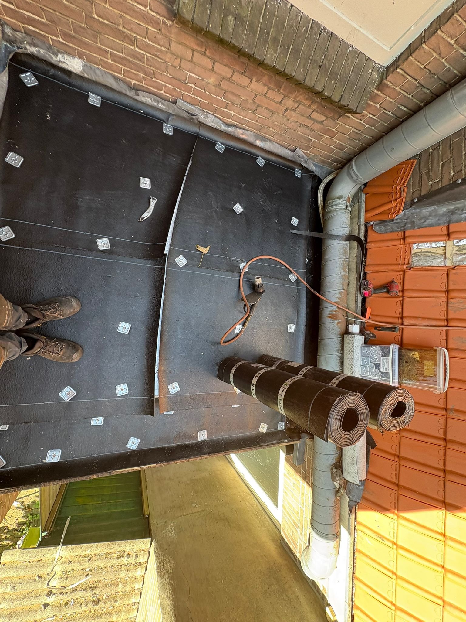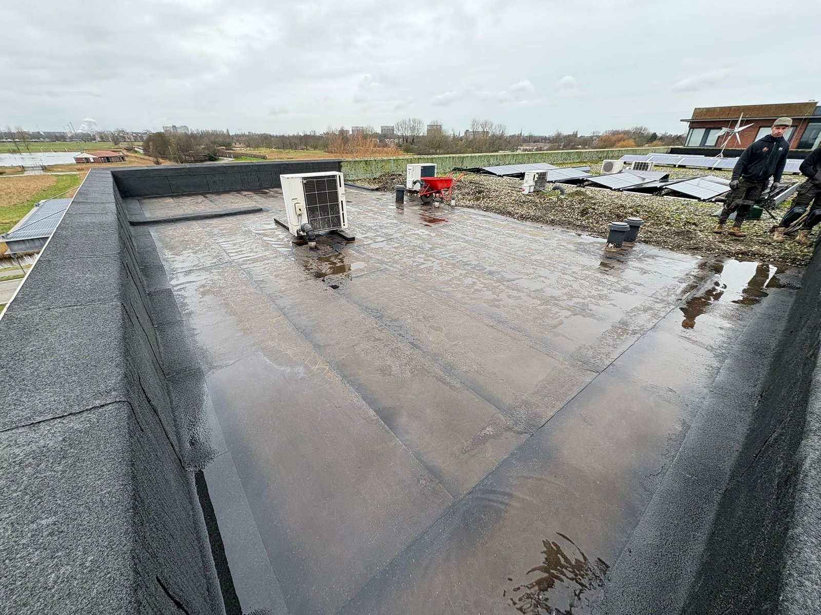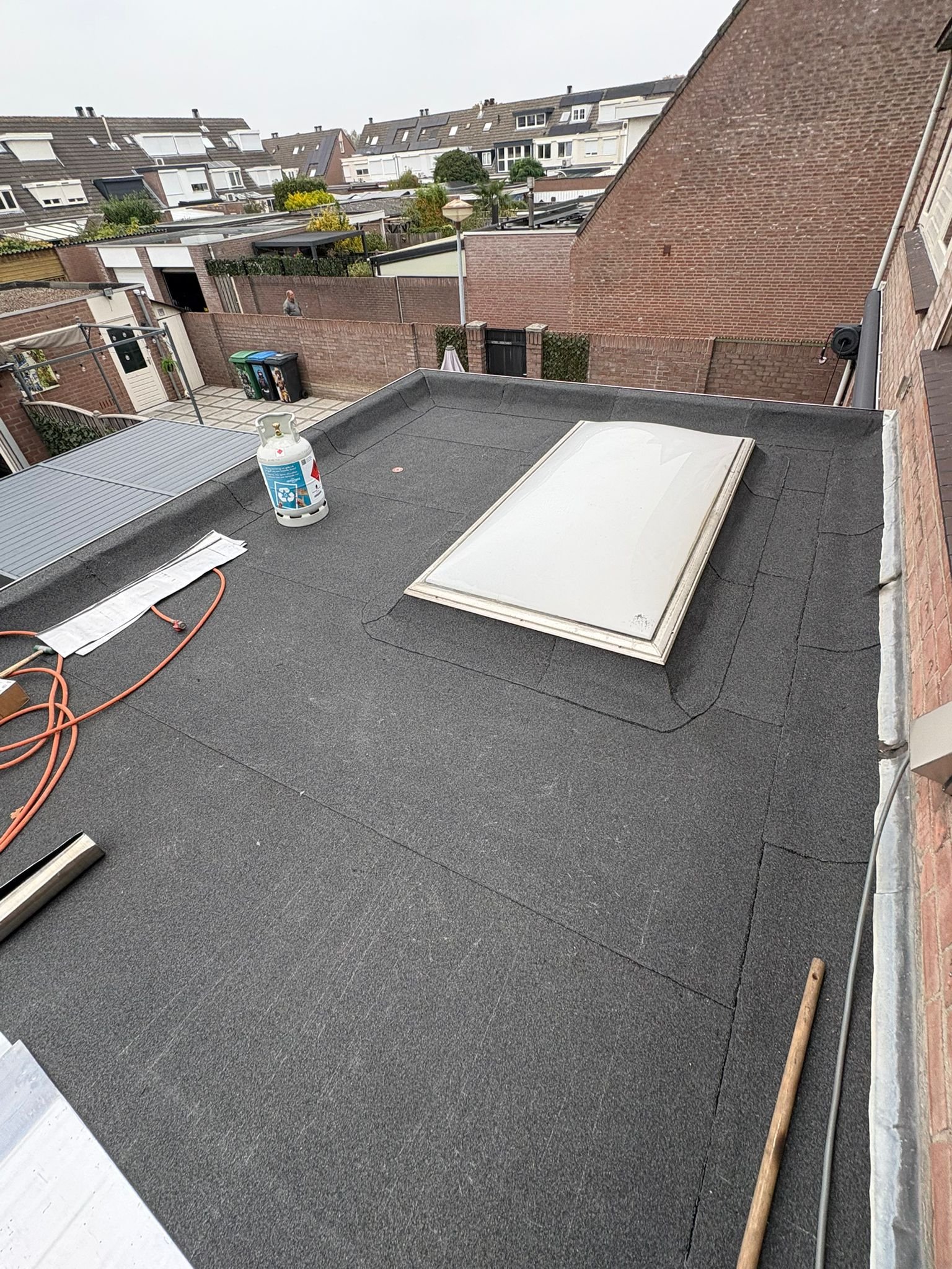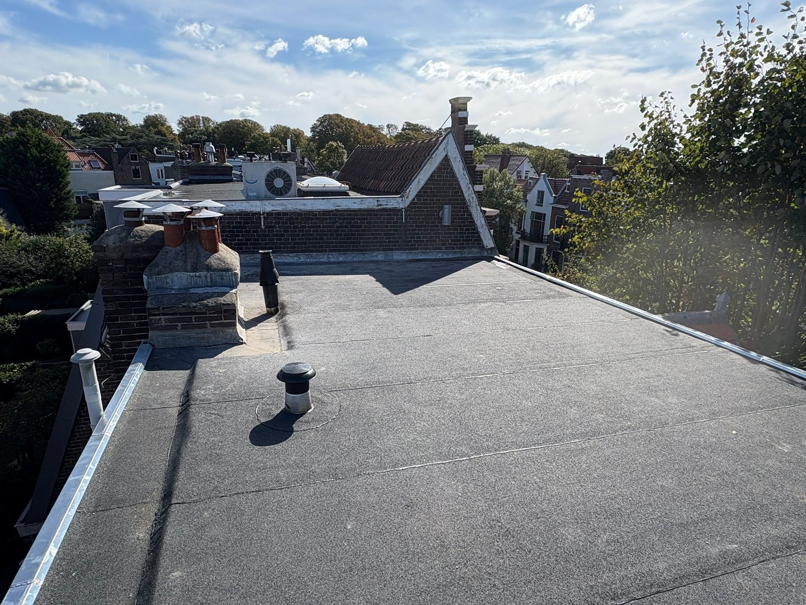 Duurzame en waterdichte afwerking voor platte daken met hoogwaardige bitumen brandrollen.
