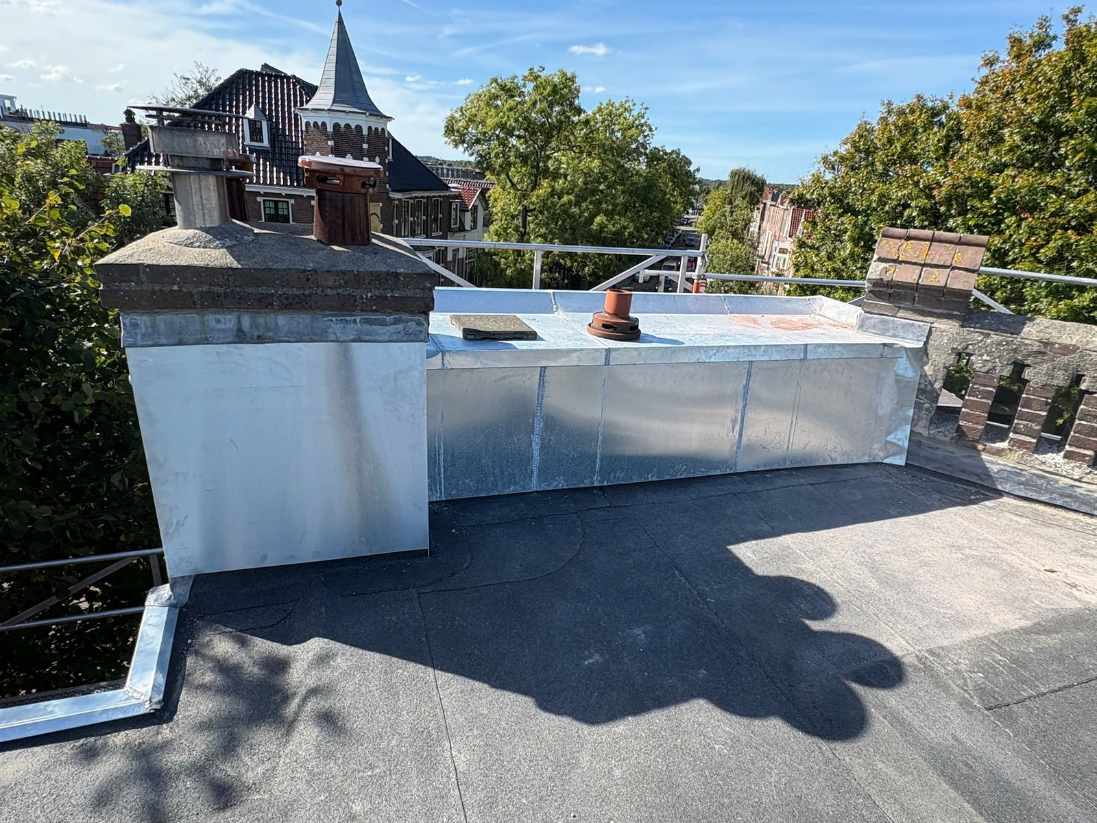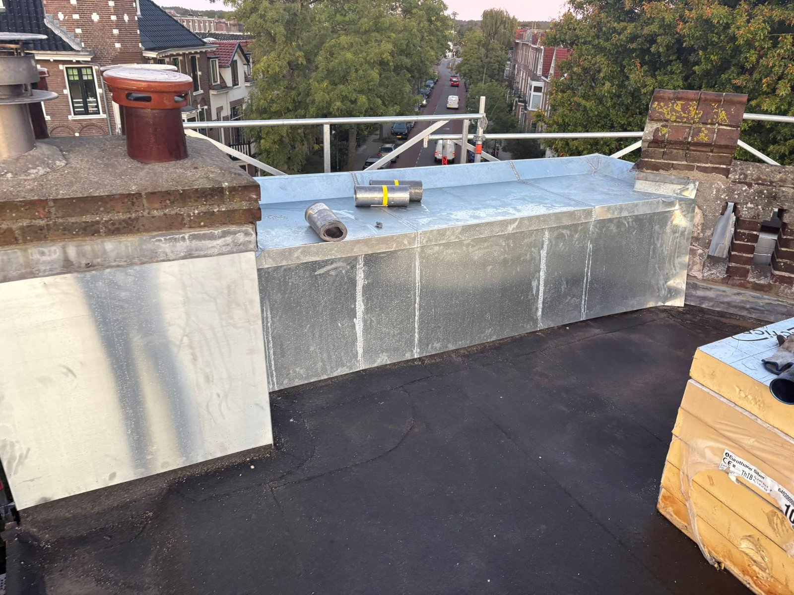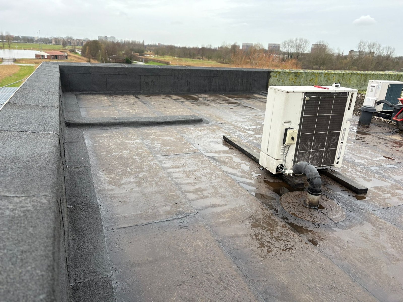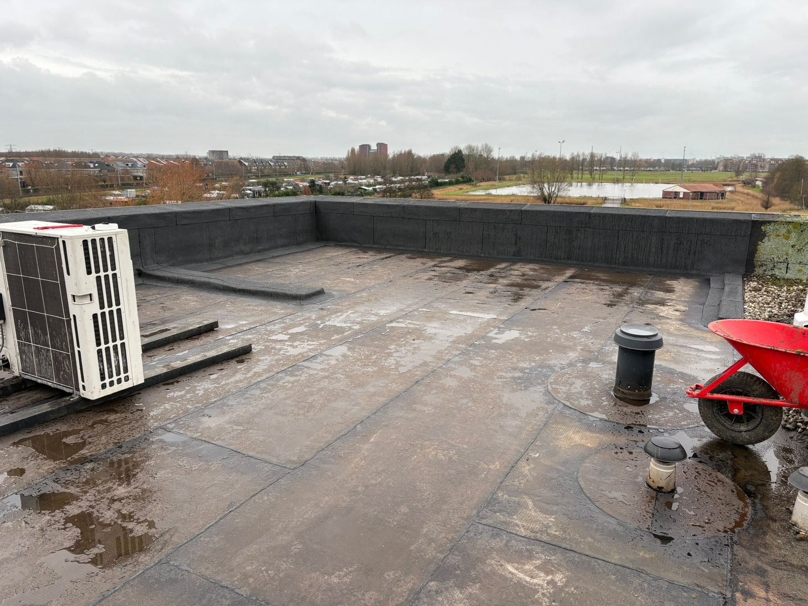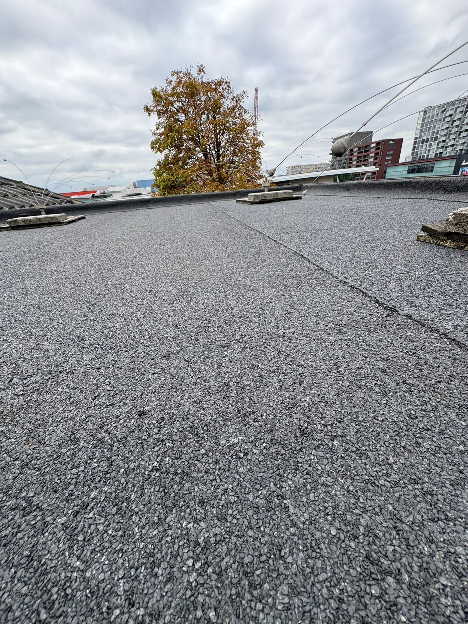 Duurzame en waterdichte afwerking voor platte daken met hoogwaardige bitumen brandrollen.